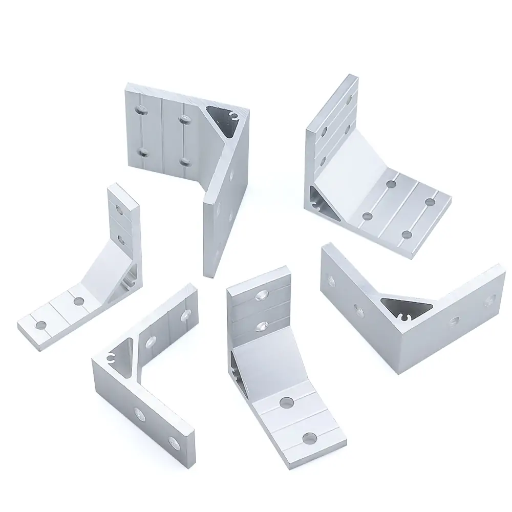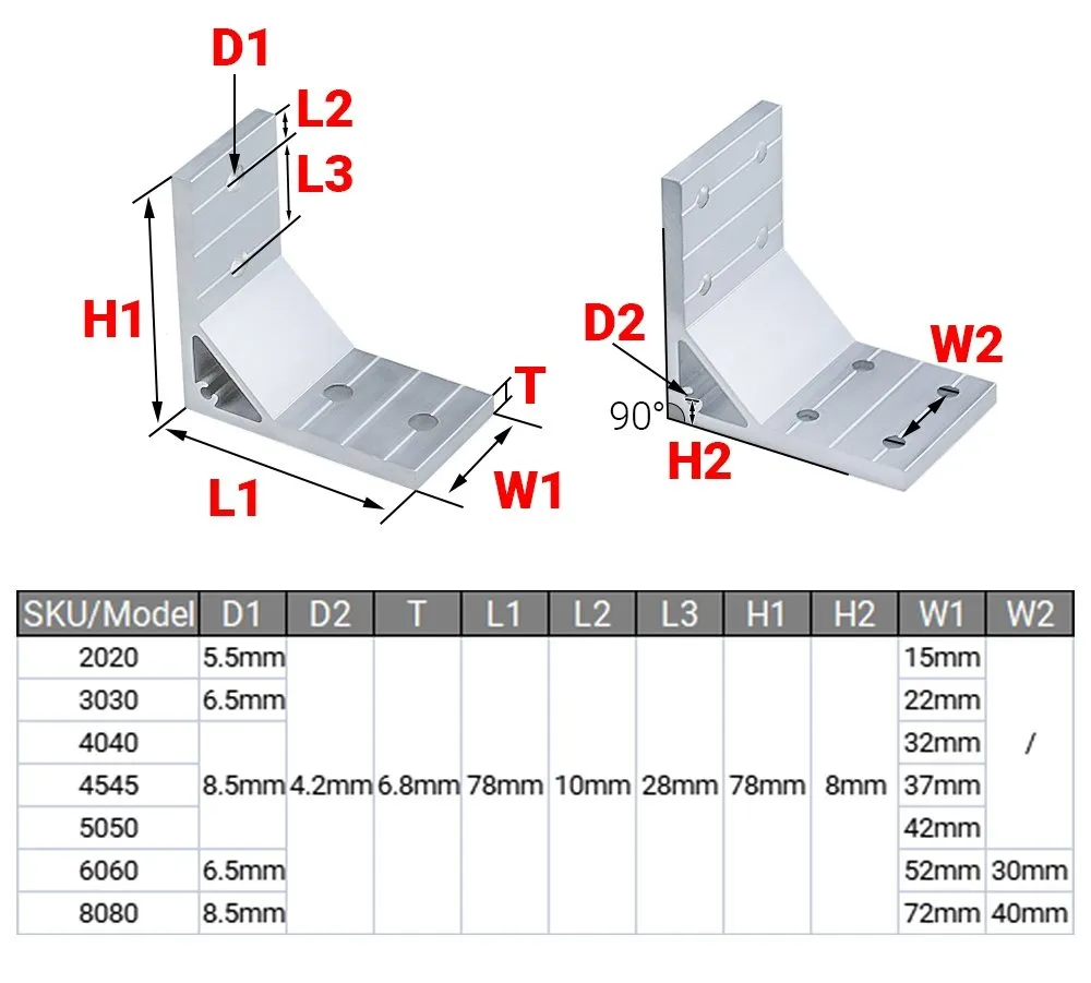 These are 78x78mm 90 Degree Enhanced Angle Aluminum used to connect 2020/3030/4040/4545/5050/6060/8080 series aluminum extrusions together for a 90-degree connection. These corner brackets are made of high-quality aluminum alloy, which is strong and durable.