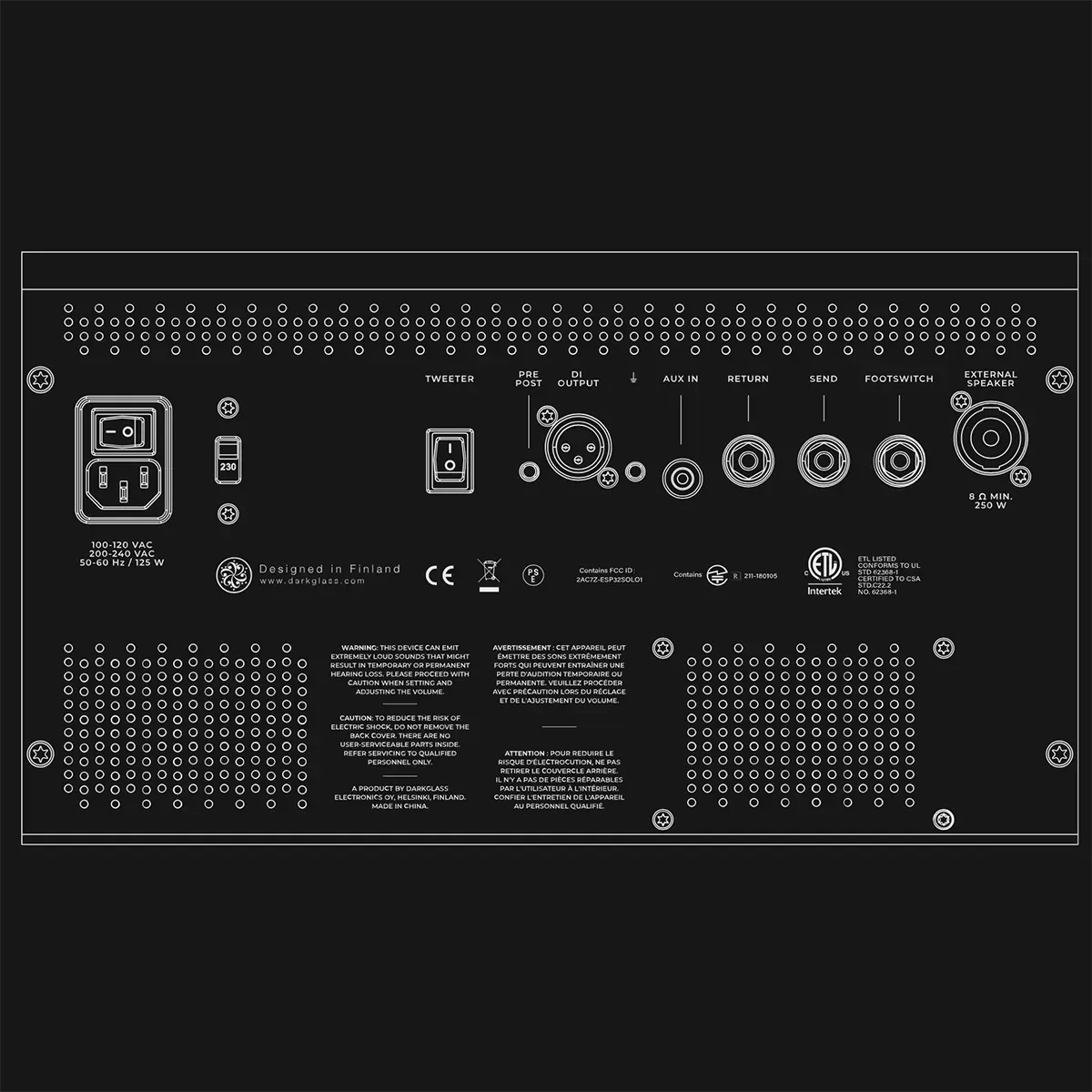 Use this connector to feed electric power to the amplifier. 100 – 230 VAC, 50-60Hz. Set the voltage selector switch to the correct position before turning on the amplifier!