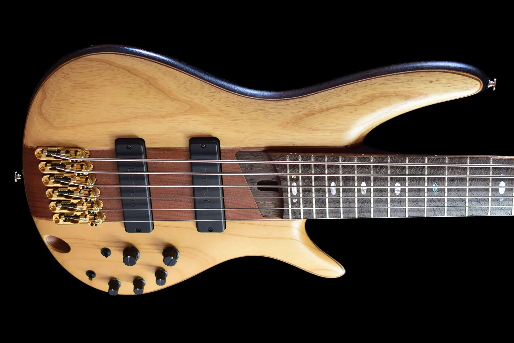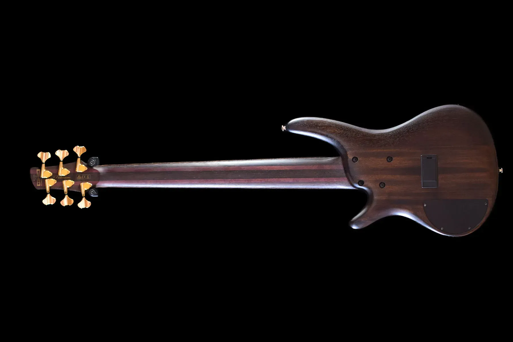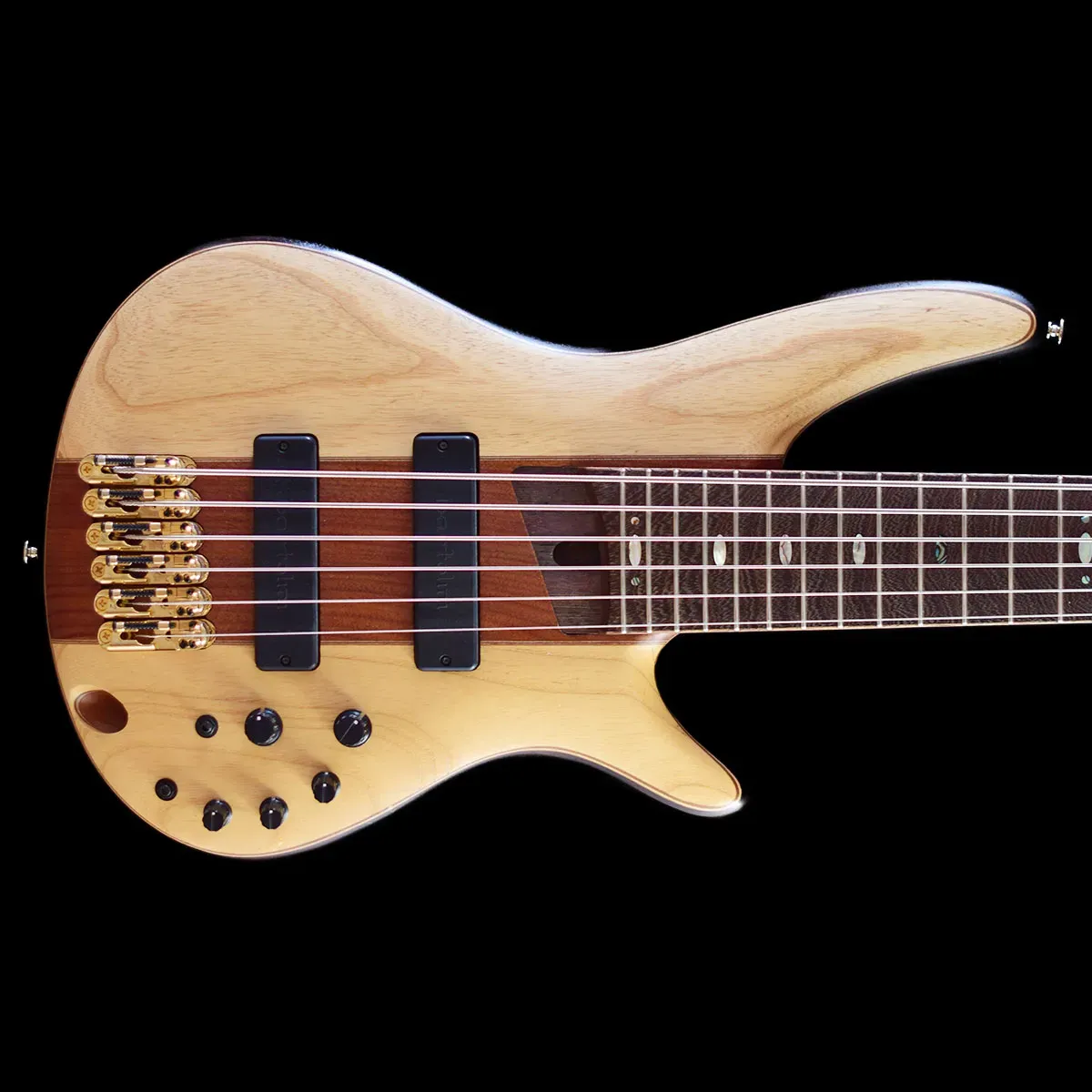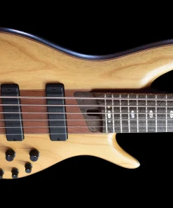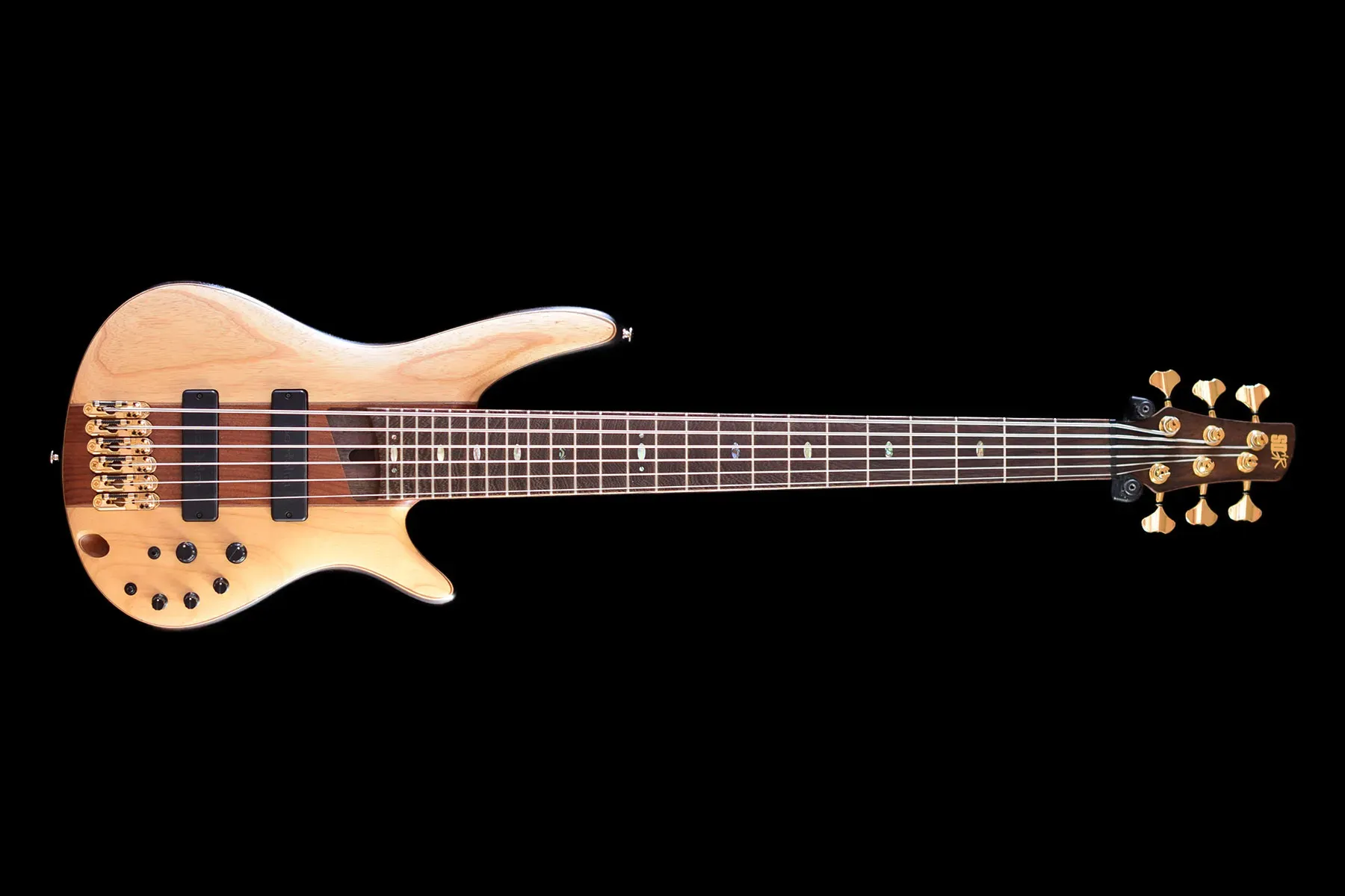 The SR1306 features an ash and walnut top on a double-cutaway mahogany body bolted to a titanium reinforced wenge and bubinga Atlas neck with a 24-fret rosewood fingerboard with binding and abalone oval position markers. Components include a pair of Bartolini pickups with an Ibanez custom preamp with a three-band EQ, individually mounted Mono-rail V bridges with 16.5 mm string spacing, a GraphTech Black TUSQ nut, and Gotoh tuning machines.
