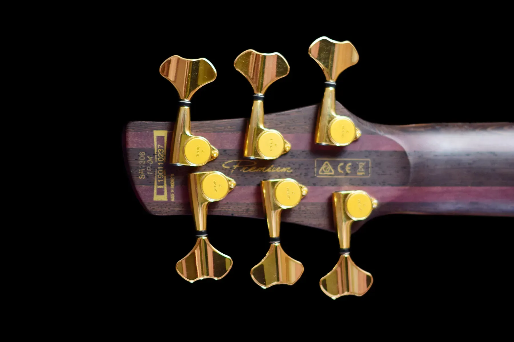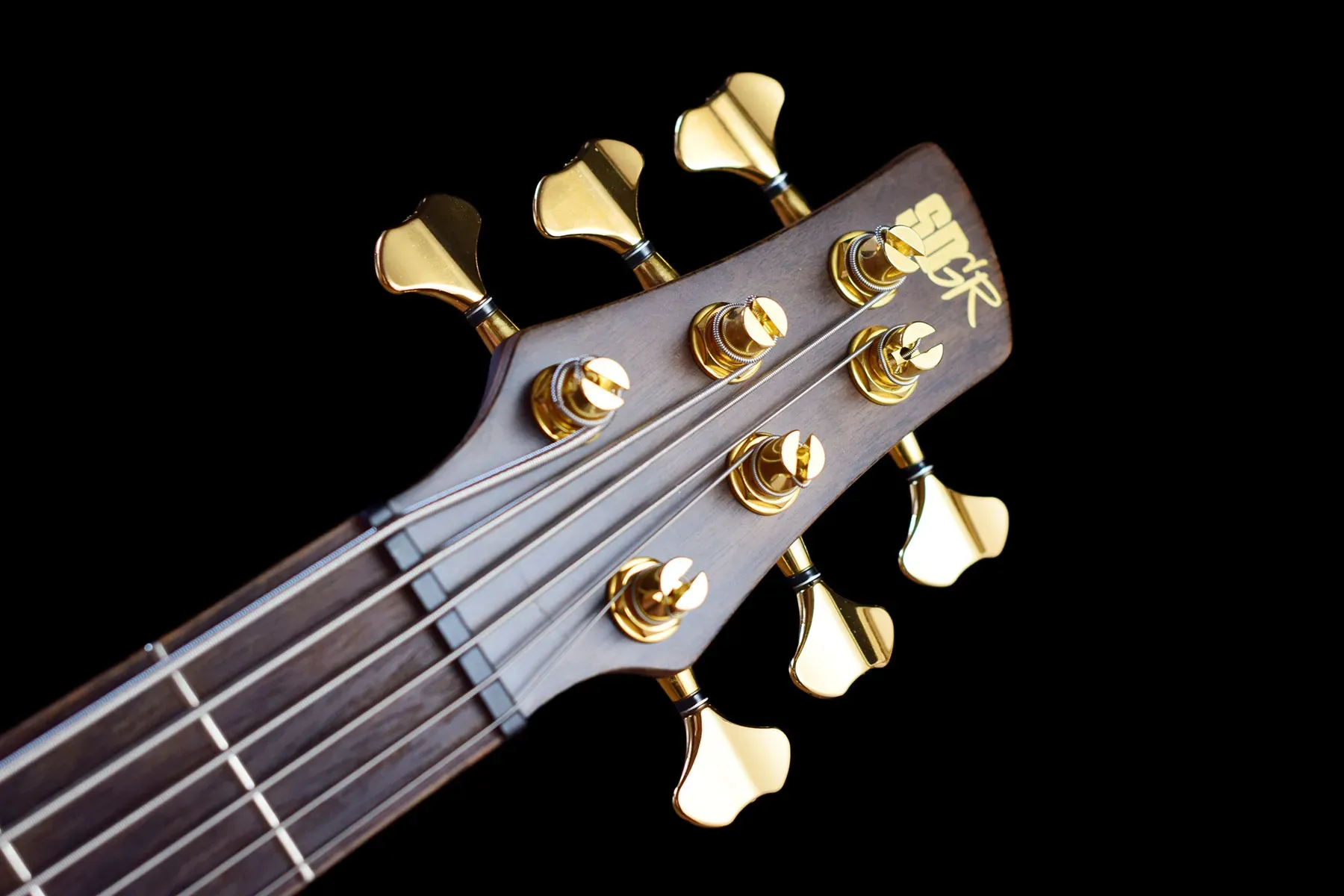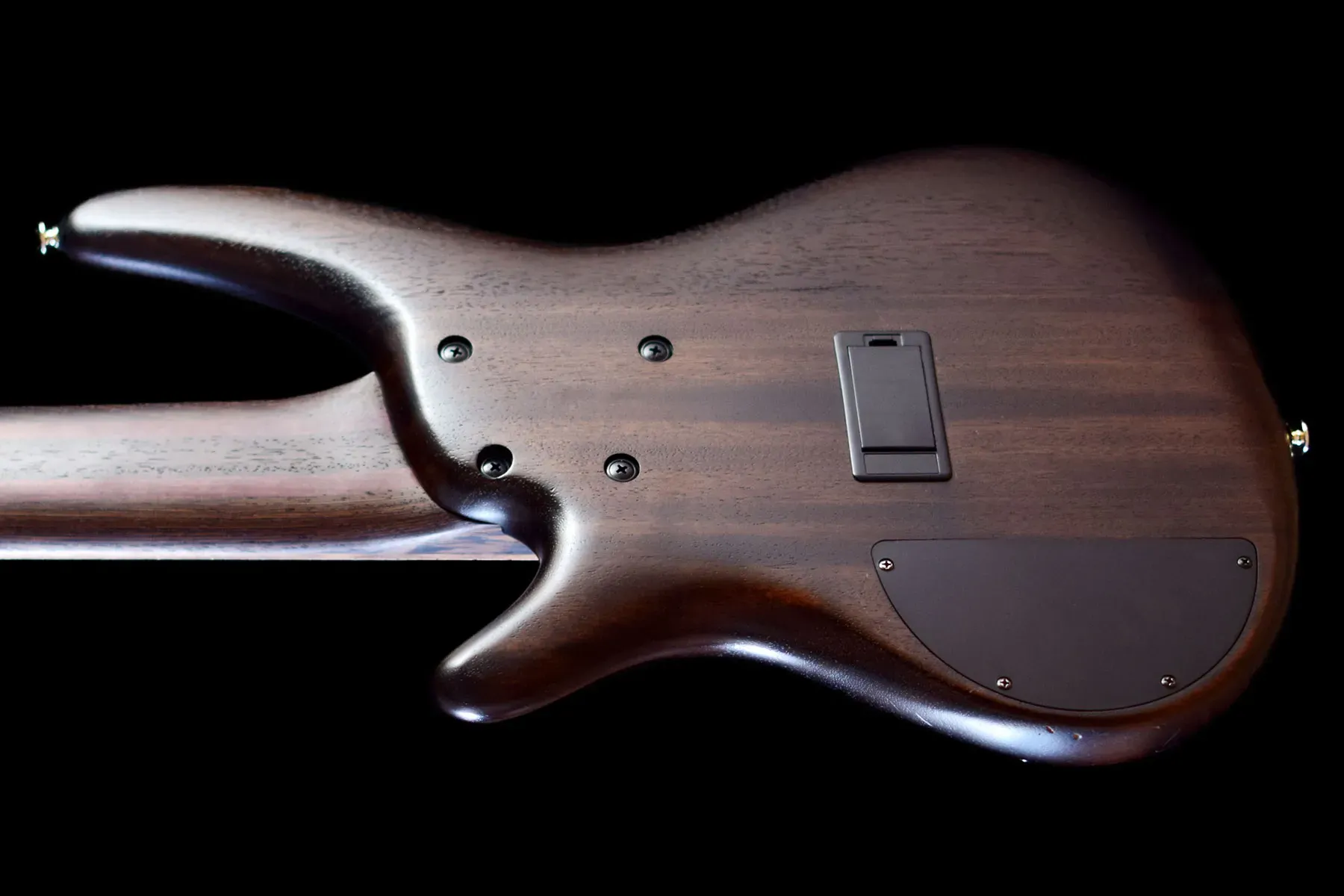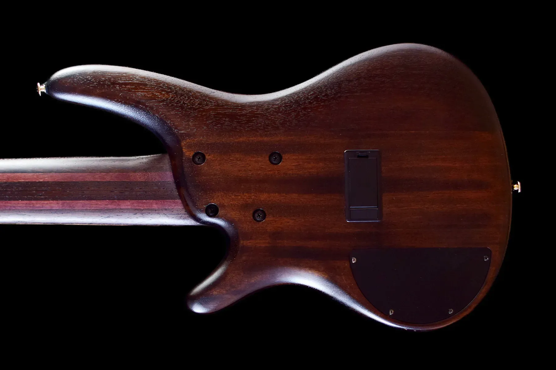 The SR1306 features an ash and walnut top on a double-cutaway mahogany body bolted to a titanium reinforced wenge and bubinga Atlas neck with a 24-fret rosewood fingerboard with binding and abalone oval position markers. Components include a pair of Bartolini pickups with an Ibanez custom preamp with a three-band EQ, individually mounted Mono-rail V bridges with 16.5 mm string spacing, a GraphTech Black TUSQ nut, and Gotoh tuning machines.