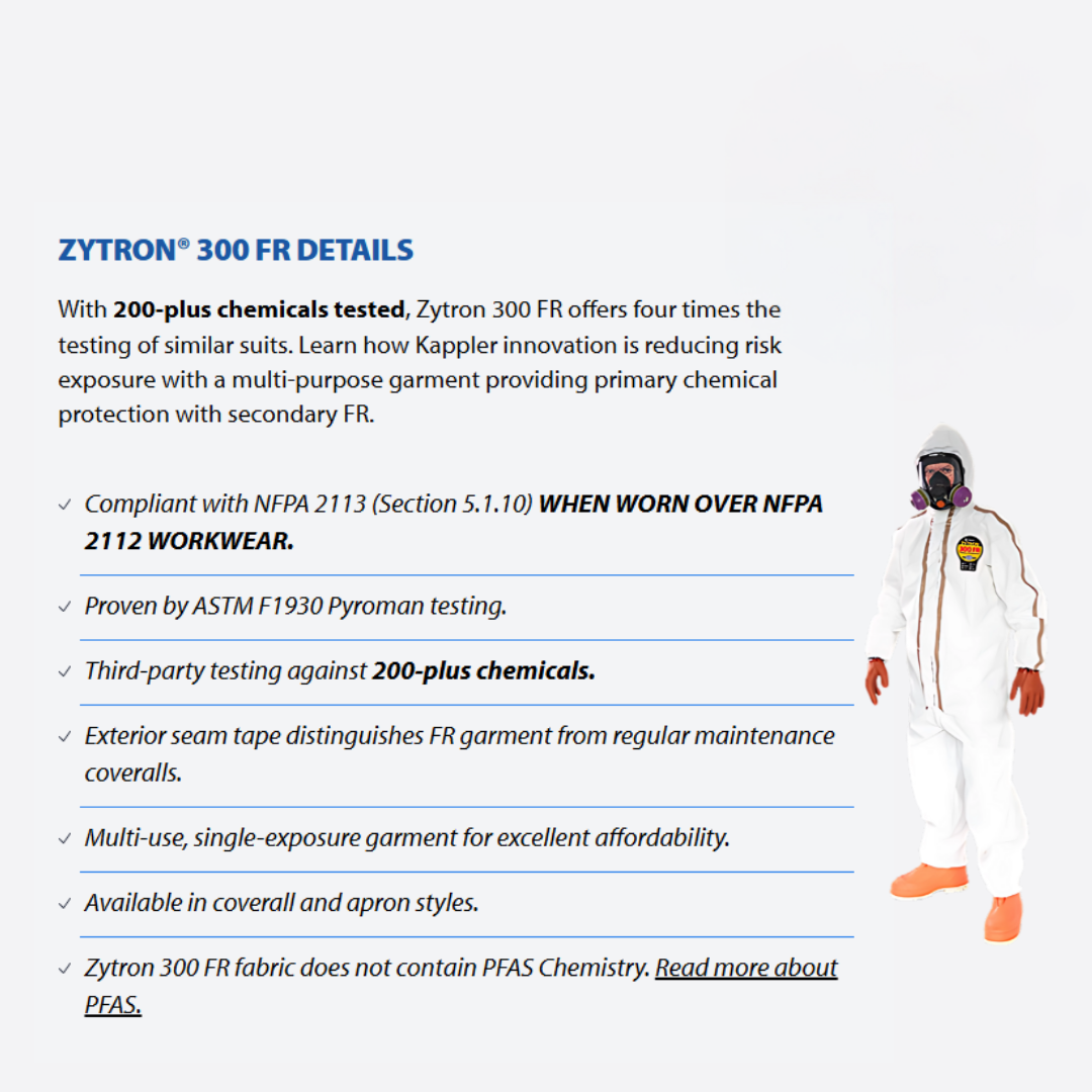 The Kappler Zytron 300 FR is ideal for Hazmat Response, Military Operations, Law Enforcement Drug Response, Chemical Handling, and Petrochemical Handling and Maintenance.