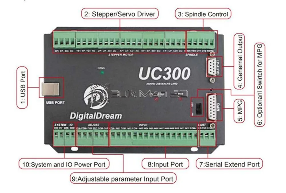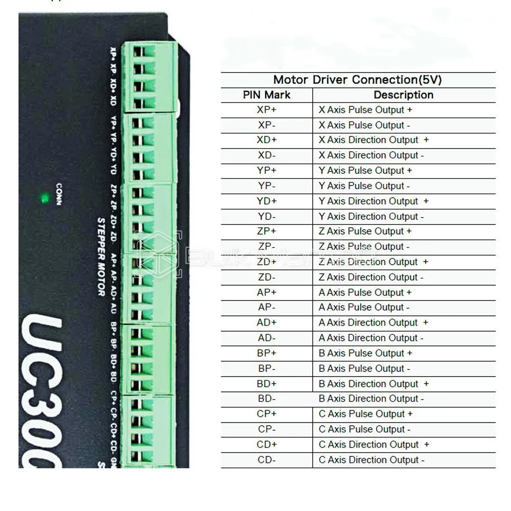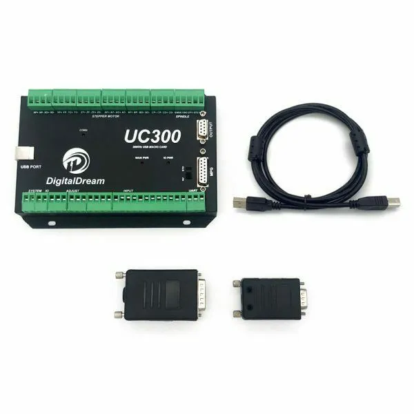 The UC300 is a high-performace external motion controller for Mach3, with USB port communicated Mach 3 software,supporting standard MPG and Digital Dream MPG.The device can communicate with a connection to a control computer’s network.The network connection can be built with direct connection by USB Port. The computer connects to the UC300 via a standard USB cable.It’s the best to shiled the communication USB cable to ignore the interferences. The device can be used to control machine tools with stepper or servo motor with pulse and direction interface;the controller can output a maximum of 300kHz stepping frequency for each axes and can work with upto 6-axes.The Controller is 3-6 Axis for user’s options.